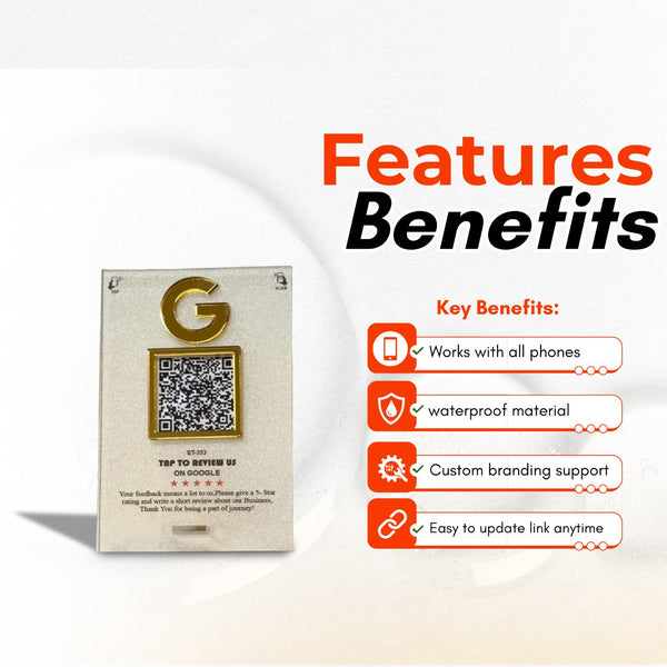 Boost your business reputation effortlessly with this Premium Google Review QR Standee. Crafted with a sleek acrylic design and a bold golden Google icon, this standee makes it easy for your customers to leave 5-star Google reviews by simply tapping or scanning the QR code.